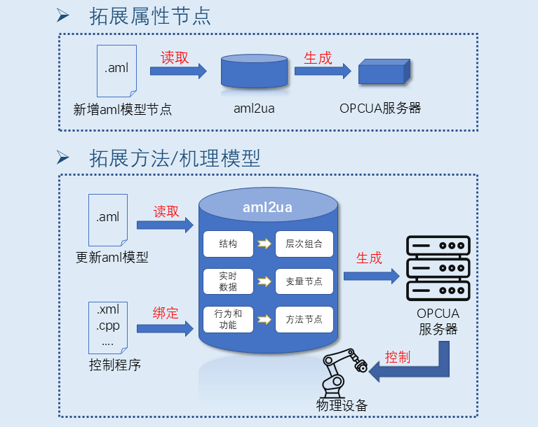 对已有模型添加属性节点:修改已有模型的aml文件,增加所需节点,aml2ua模型自动生成工具自动解析,生成对应OPCUA变量节点或对象节点。